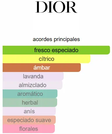 Sauvage Eau de Parfum de Dior es una fragancia de la familia olfativa Oriental Fougère para Hombres. La Nota de Salida es bergamota; las Notas de Corazón son pimienta de Sichuan, lavanda, anís estrellado y nuez moscada; las Notas de Fondo son ambroxan y vainilla.